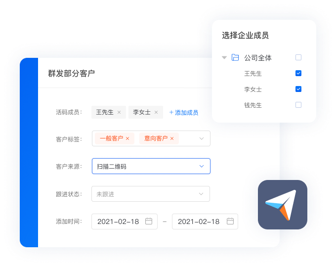 支持给客户、客户群和企业成员群发消息,并可精准筛选用户,提升服务质量